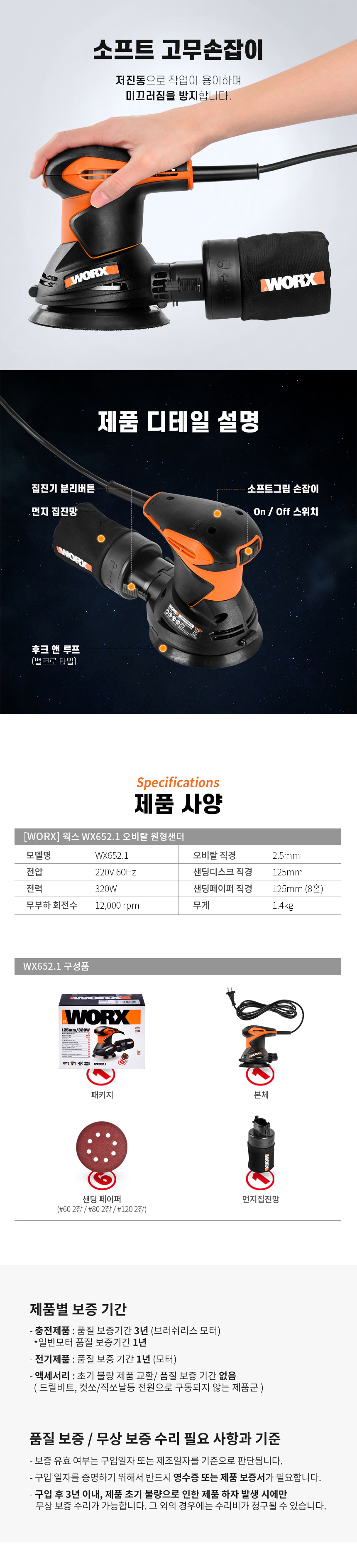 웍스 WX652.1 유선 전기 원형 샌더 오비탈 샌딩기 목공용 5인치