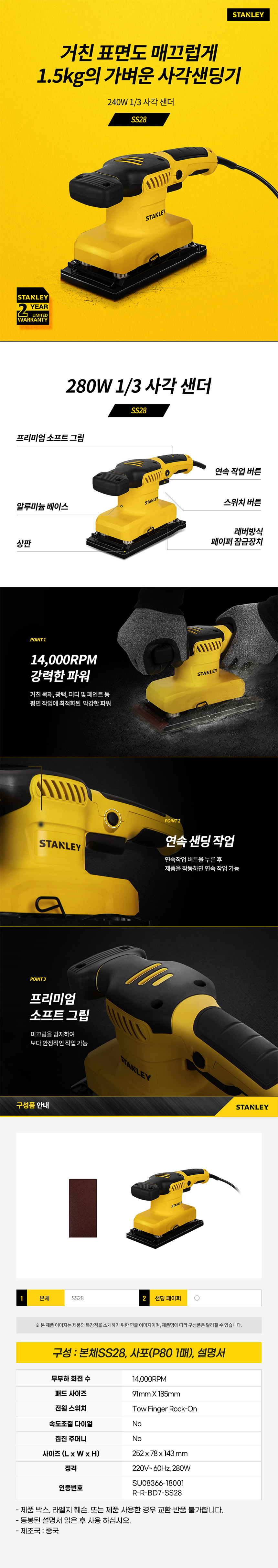 스탠리 280W 유선 1/3 시트 사각 샌더 샌딩기 SS28