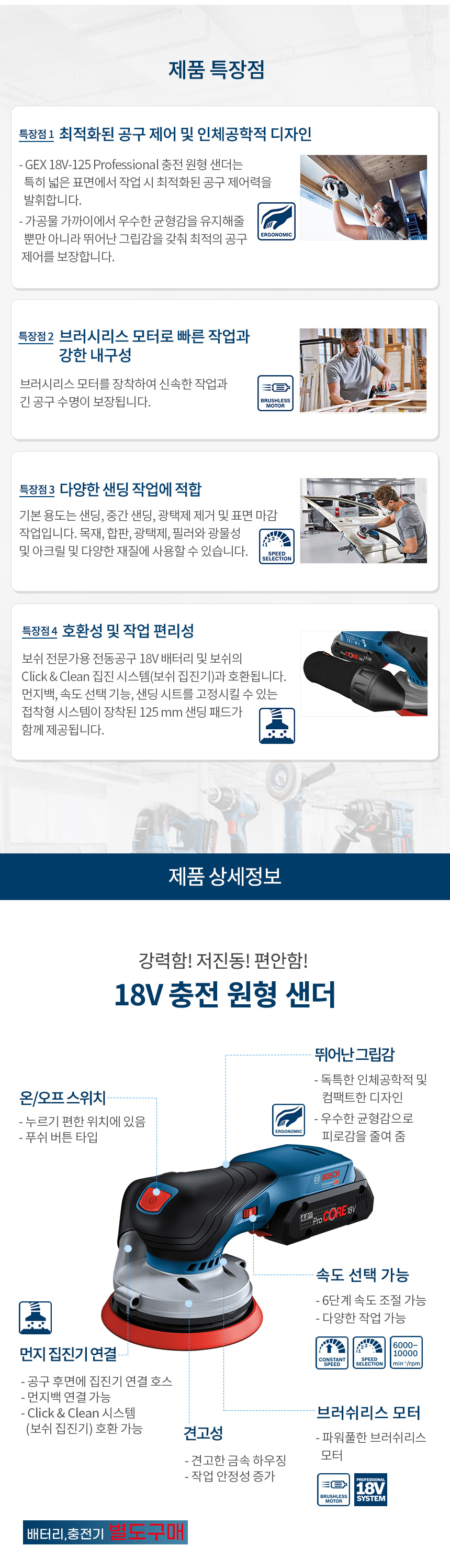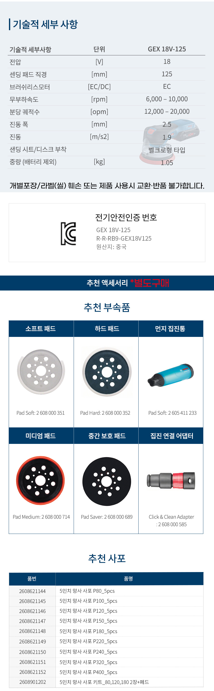 보쉬 GEX 18V-125 충전 원형 샌더 베어툴 배터리 미포함 06013722B0