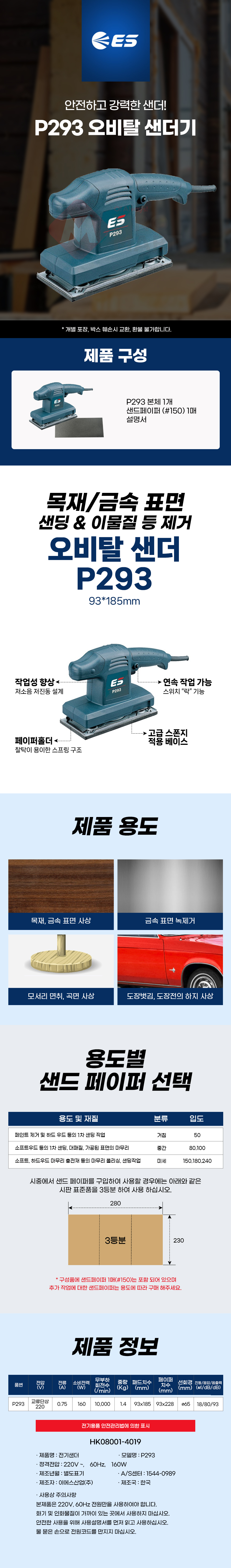ES 오비탈 샌더 P293 유선 전기 샌더기 샌딩기 사포 페파 목공