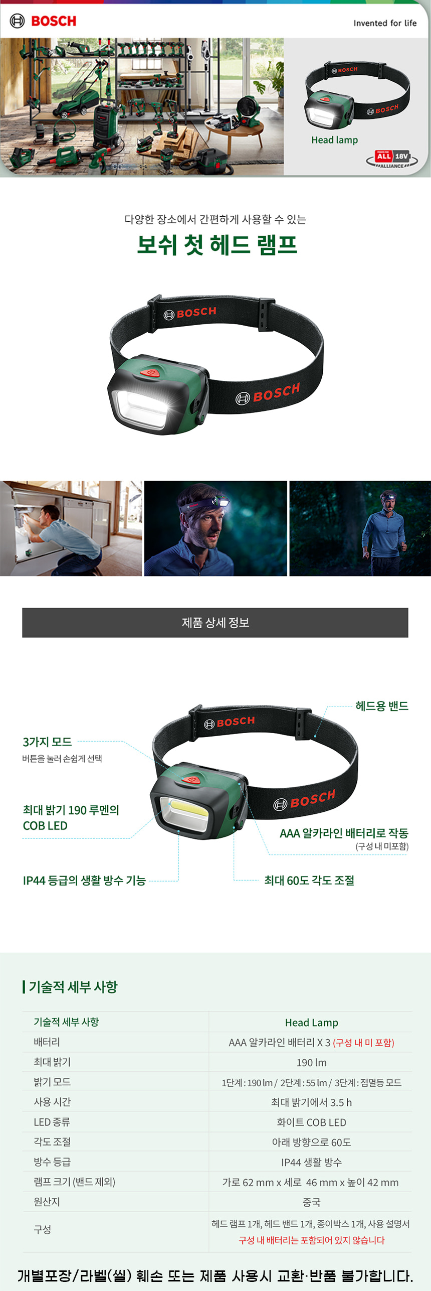 보쉬 헤드 램프 1600A0307X AAA 배터리 미포함 캠핑 산업용 공업영 조명 LED