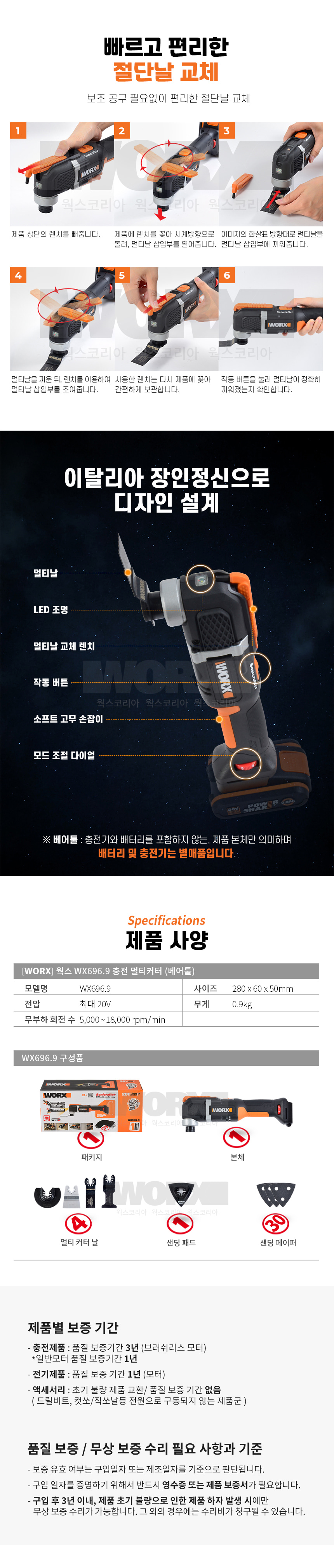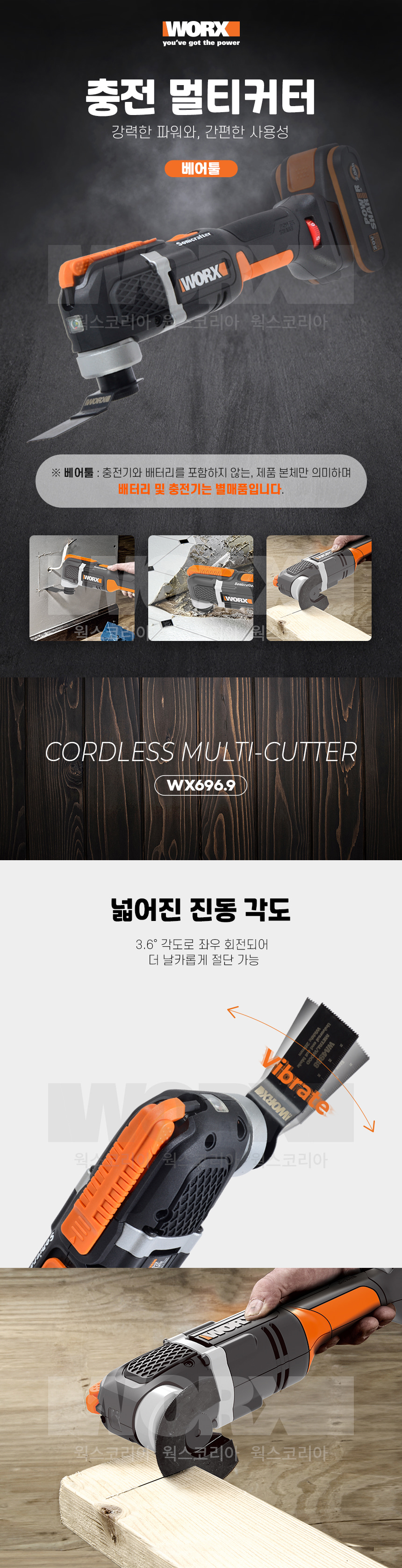 웍스 WX696.9 충전 20V 멀티커터 만능커터 다용도 샌딩 목재 금속 컷팅 베어툴 배터리 충전기 미포함