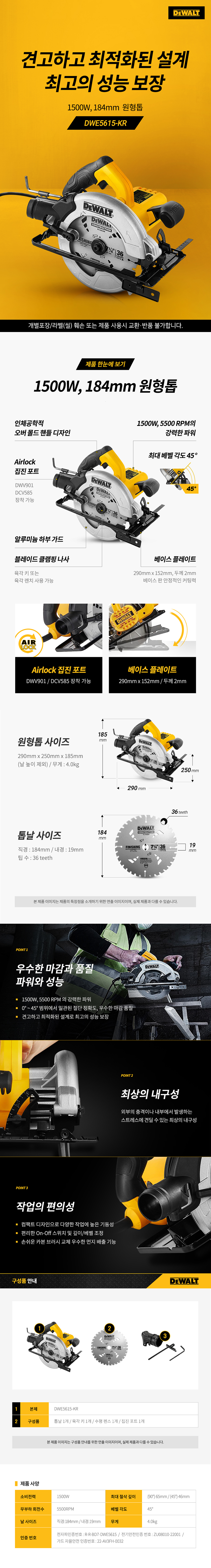 디월트 1500W 184mm 전기 유선 원형톱 DWE5615 목재 나무 목공 절단기 컷팅기 톱