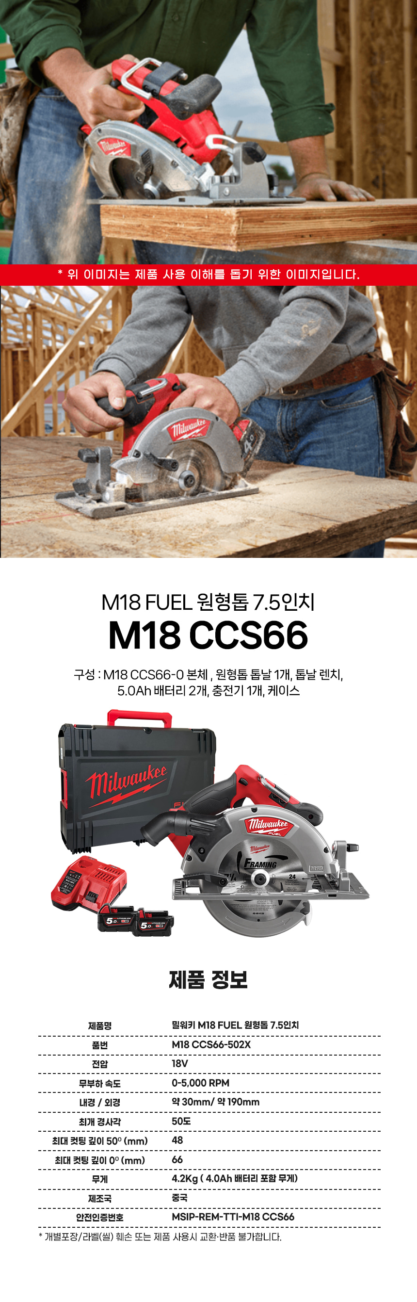 밀워키 18V FUEL 충전 원형톱 세트 7.5인치 M18 CCS66-502X 목재용 톱 컷팅 절단