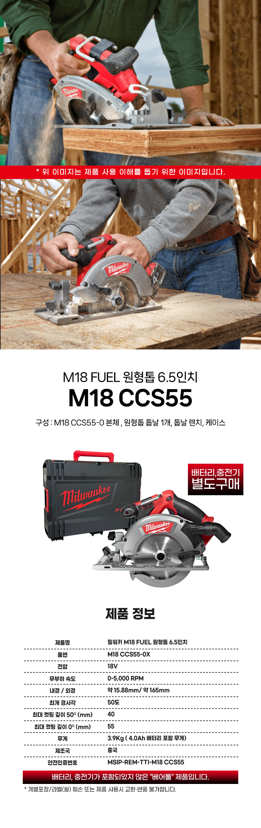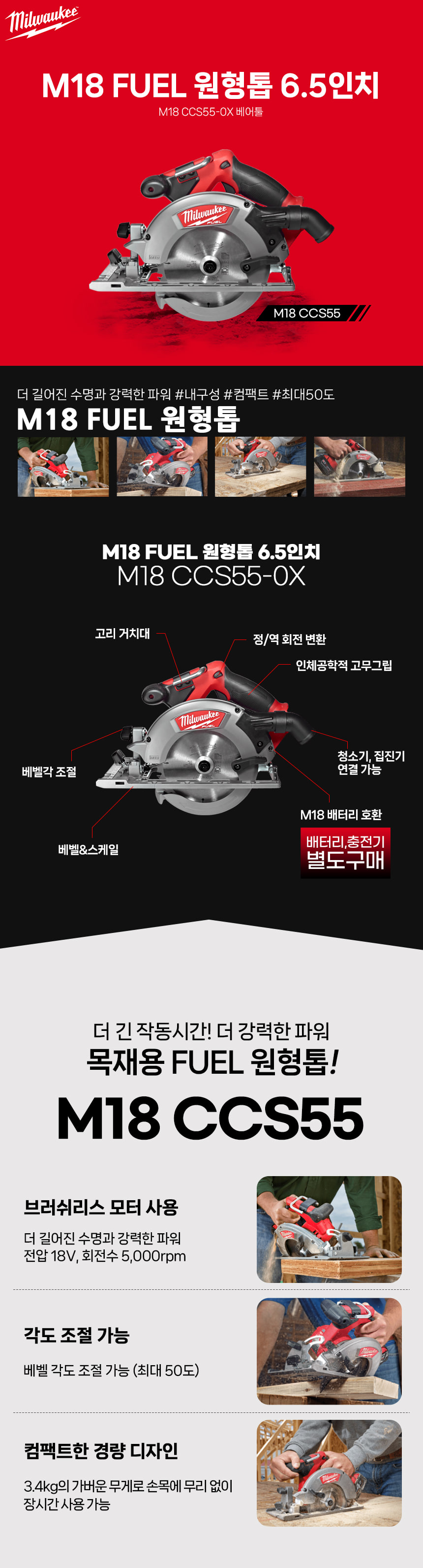 밀워키 18V FUEL 충전 원형톱 베어툴 6.5인치 M18 CCS55-0X 목재용 톱 컷팅 절단