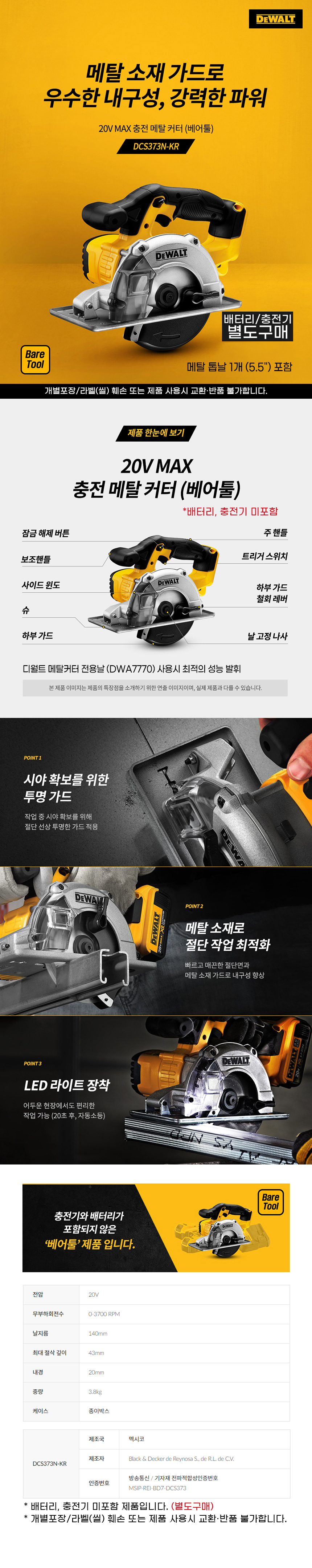 디월트 20V MAX 충전 메탈 커터 베어툴 DCS373N 원형톱 컷팅 톱 절단 목재 철재