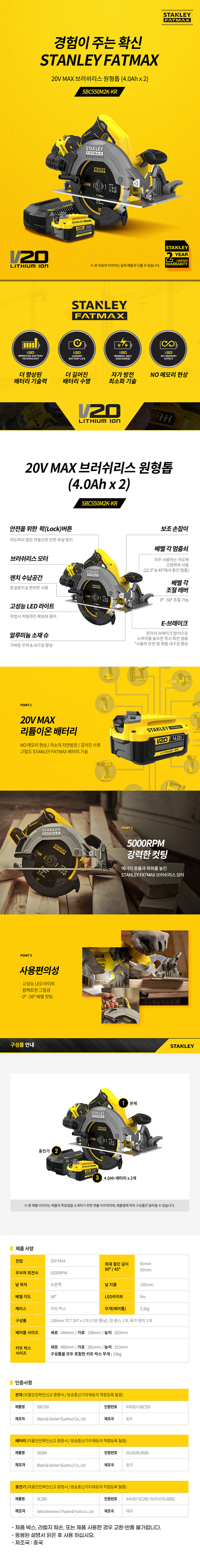스탠리 SBC550M2K 충전 브러쉬리스 원형톱 무선 원형톱 절단기 20V 4.0Ah