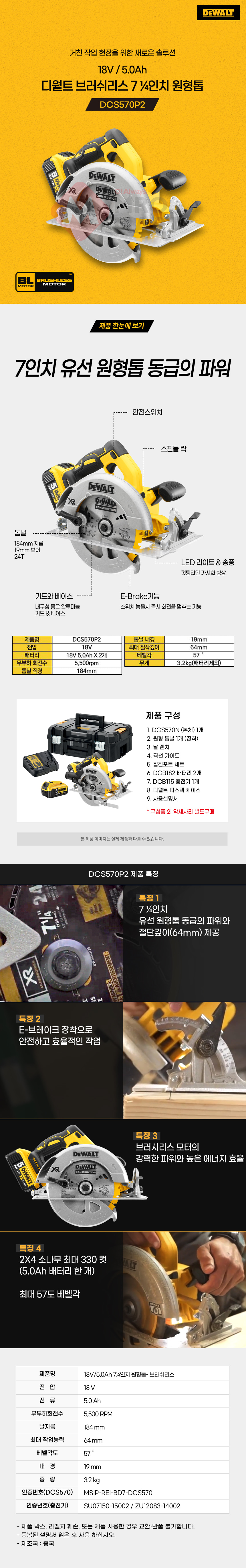디월트 DCS570P2 충전 18V 브러쉬리스 7인치 원형 톱 목재 절단 절삭
