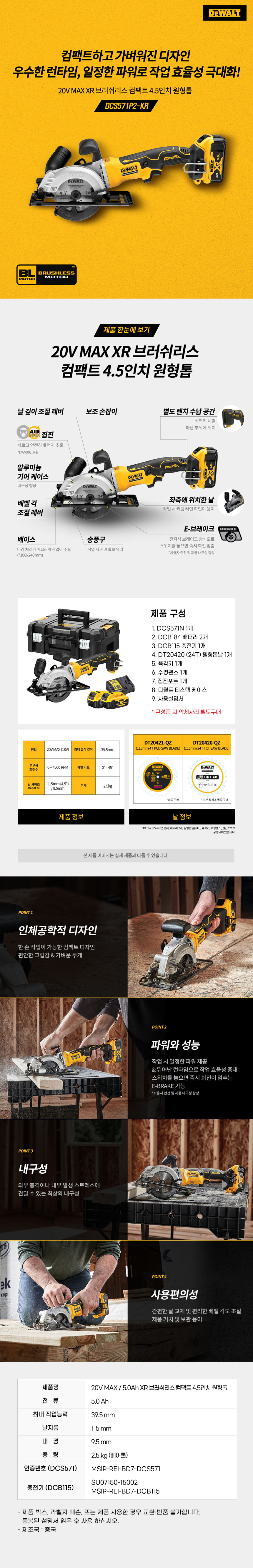디월트 DCS571P2 충전 원형 톱 4.5인치 20V 18V 무선 원형 톱 컷팅 목공 시멘트 금속 배터리 포함