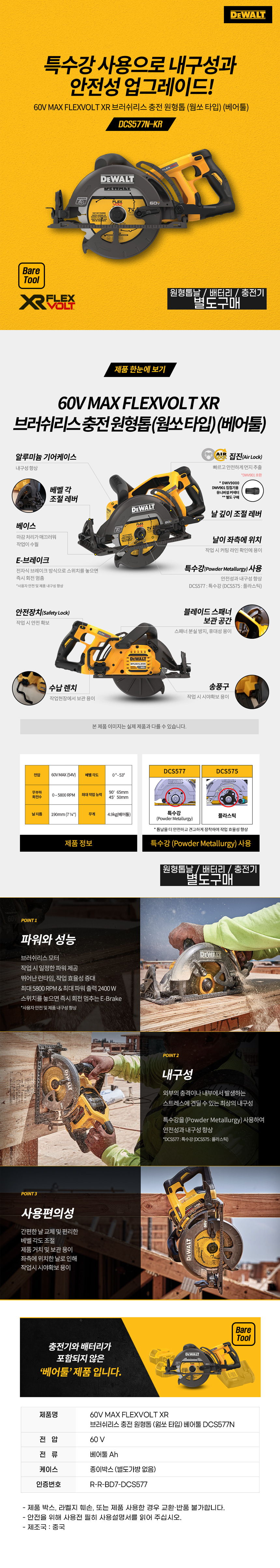 디월트 60V 54V 플렉스볼트 브러쉬리스 충전 원형톱 베어툴 DCS577N