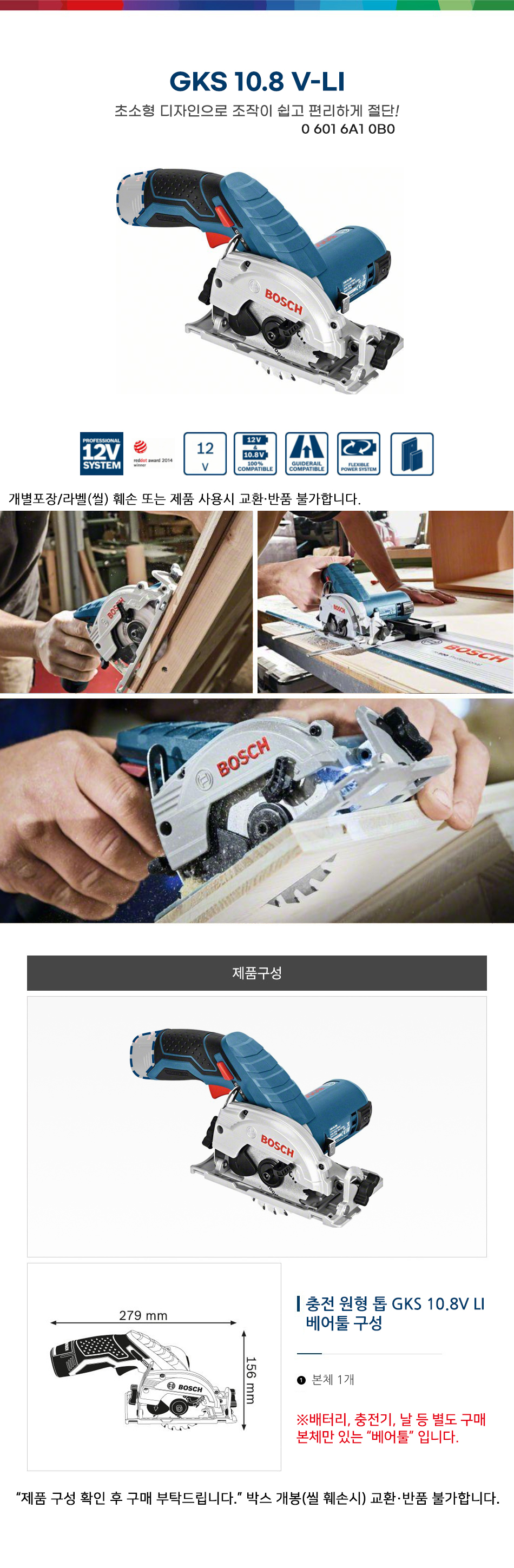 보쉬 GKS 10.8V LI 충전 휴대용 원형톱 06016A10B0 베어툴 배터리 없음
