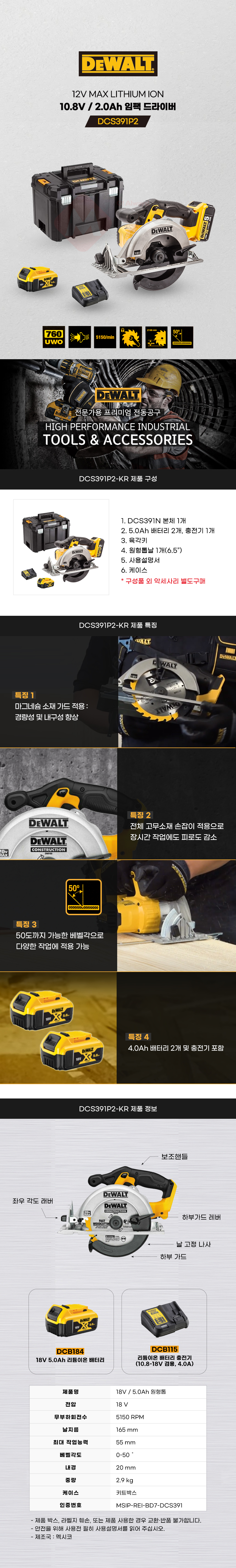 디월트 18V 5.0Ah 6.5인치 충전 원형톱 DCS391P2 배터리 세트 목재 절단 컷팅