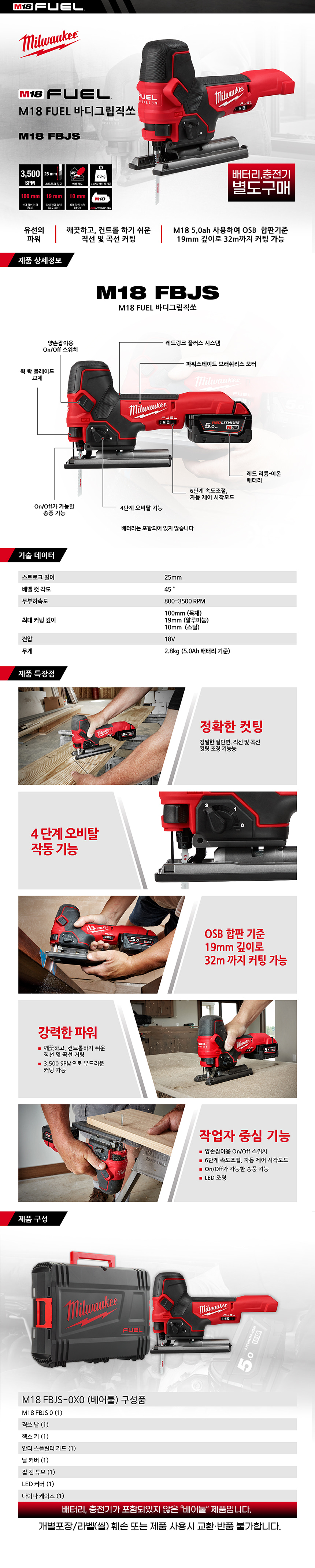 밀워키 18V FUEL 충전 바디 그립 직쏘 베어툴 M18 FBJS-0X0 직소 직소기 톱 절단 목재 금속