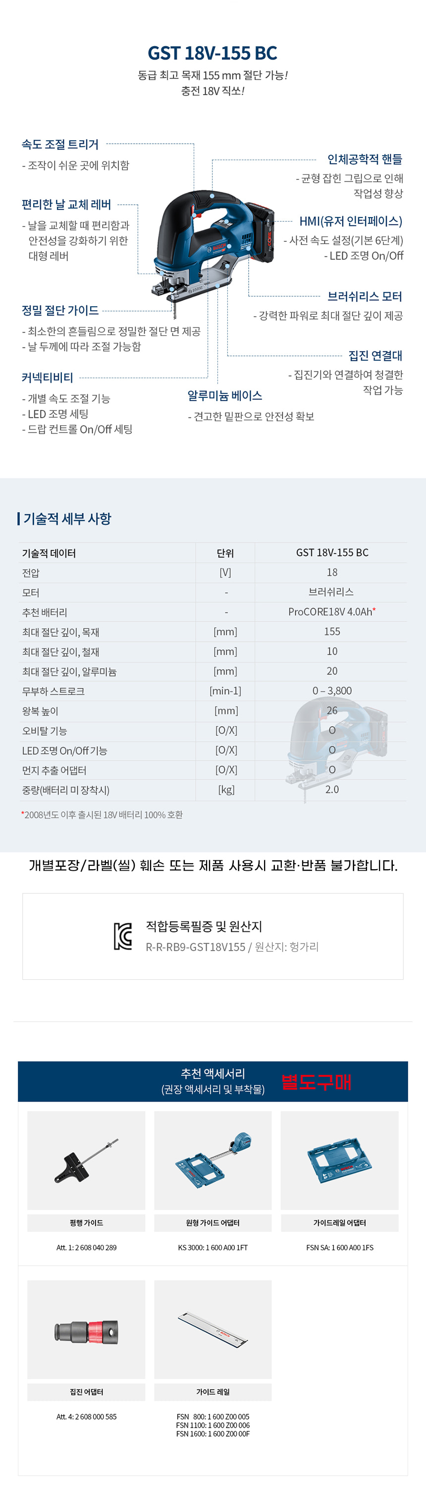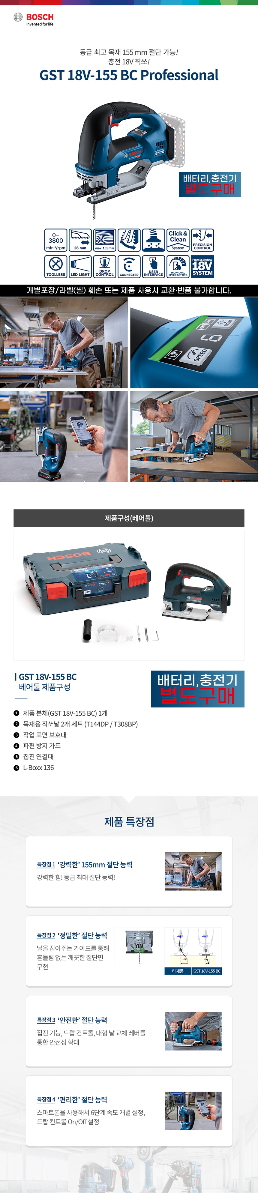 보쉬 GST 18V-155 BC 충전 직쏘 베어툴 06015B10B0 L-Boxx 직소 직소기 톱 절단 목재 철재
