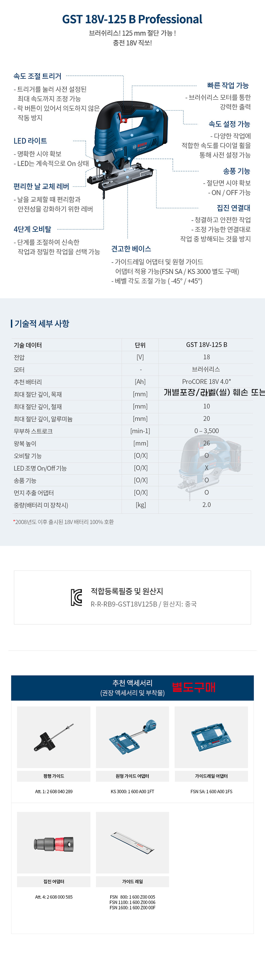 보쉬 GST 18V-125B 충전 직쏘 베어툴 06015B30B0 L-Boxx 직소 직소기 톱 절단 목재 철재
