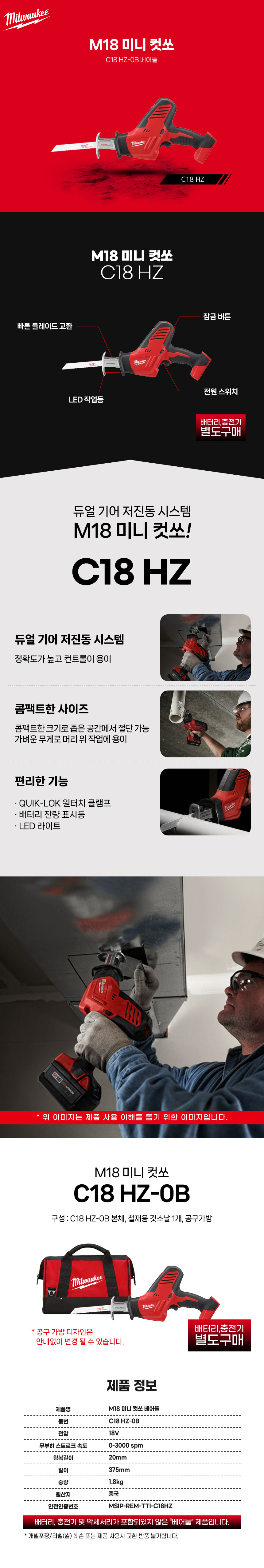 밀워키 18V 충전 미니 컷쏘 베어툴 C18 HZ-0B 가방 포함 컷소 컷쏘기 절단 톱 컷팅