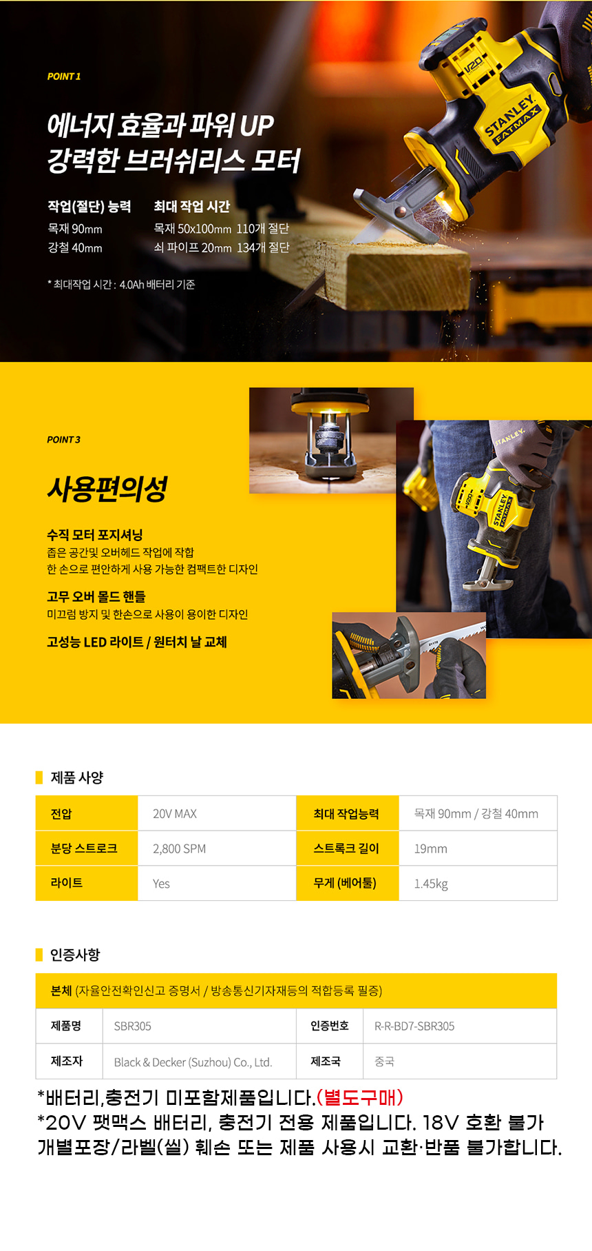 스탠리 20V MAX 팻맥스 브러쉬리스 충전 컴팩트 컷쏘 베어툴 SBR305 컷소 목재 금속 절단 톱 컷팅