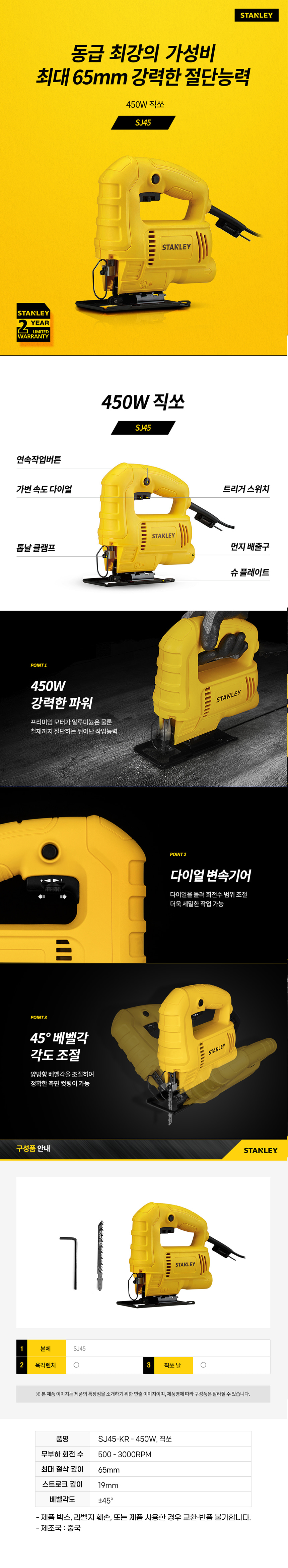 스탠리 600W 유선 전기 직쏘 SJ60 직소 절단 톱