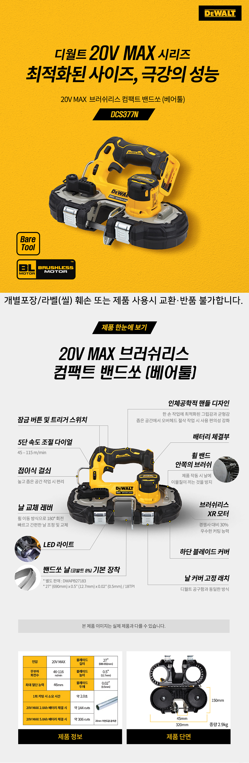 디월트 20V MAX 브러쉬리스 컴팩트 밴드쏘 베어툴 배터리 미포함 DCS377N