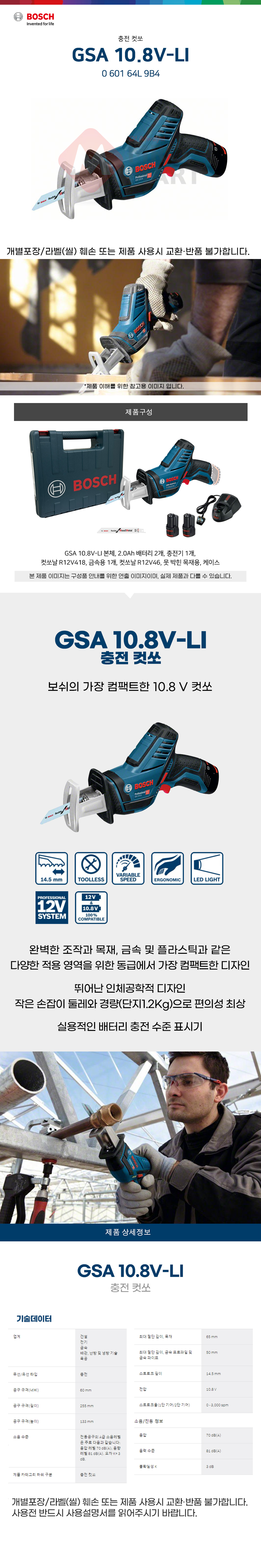 보쉬 GSA 10.8V-LI 충전 미니 컷쏘 060164L9B4 컷소 컷소기 소형 목재 금속 컷팅 2.0Ahx2 세트