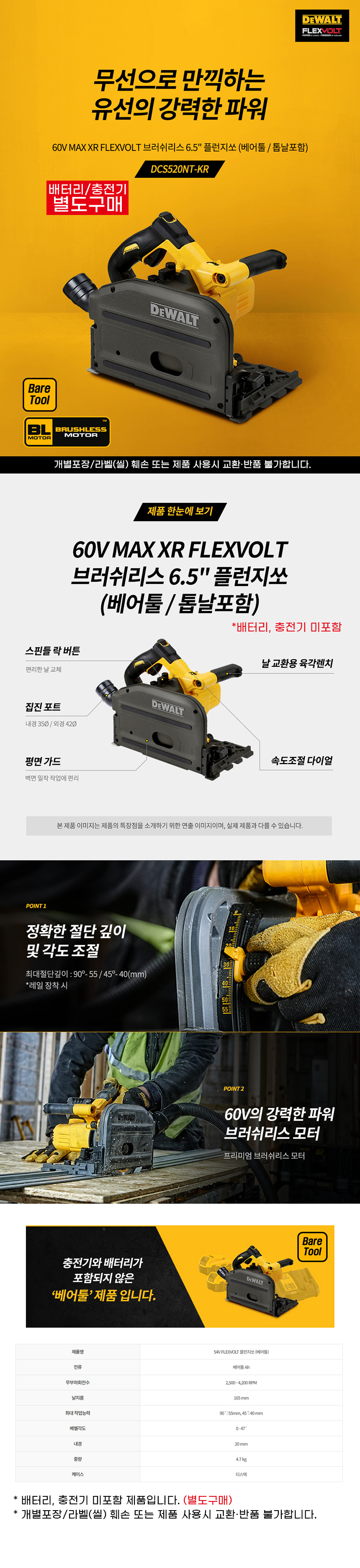 디월트 60V 충전 플렉스볼트 플런지쏘 베어툴 DCS520NT 톱날 포함 컷팅 절단 목재
