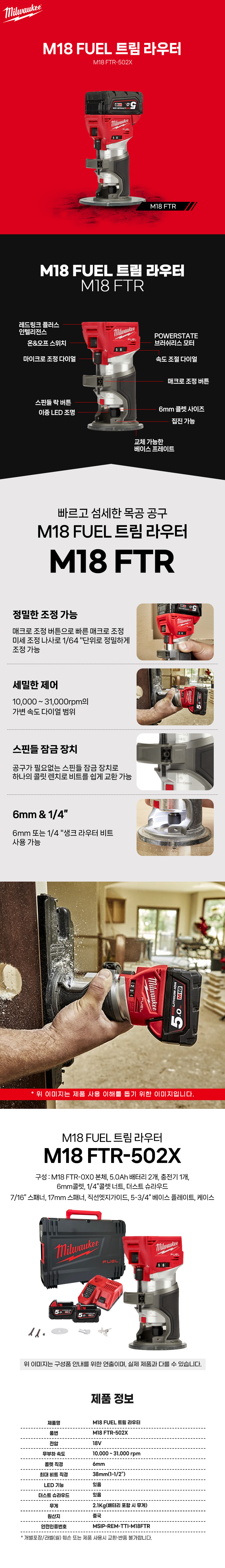 밀워키 18V 5.0Ah FUEL 충전 트림 라우터 M18 FTR-502X 배터리 세트