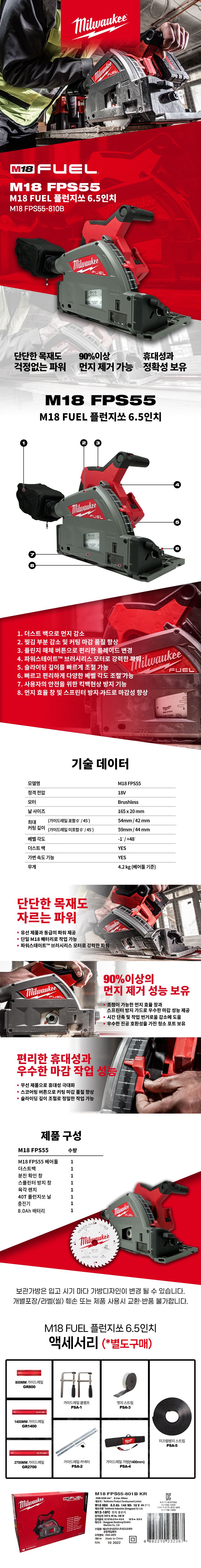 밀워키 18V FUEL 충전 플런지쏘 배터리 세트 6.5인치 M18 FPS55-801B