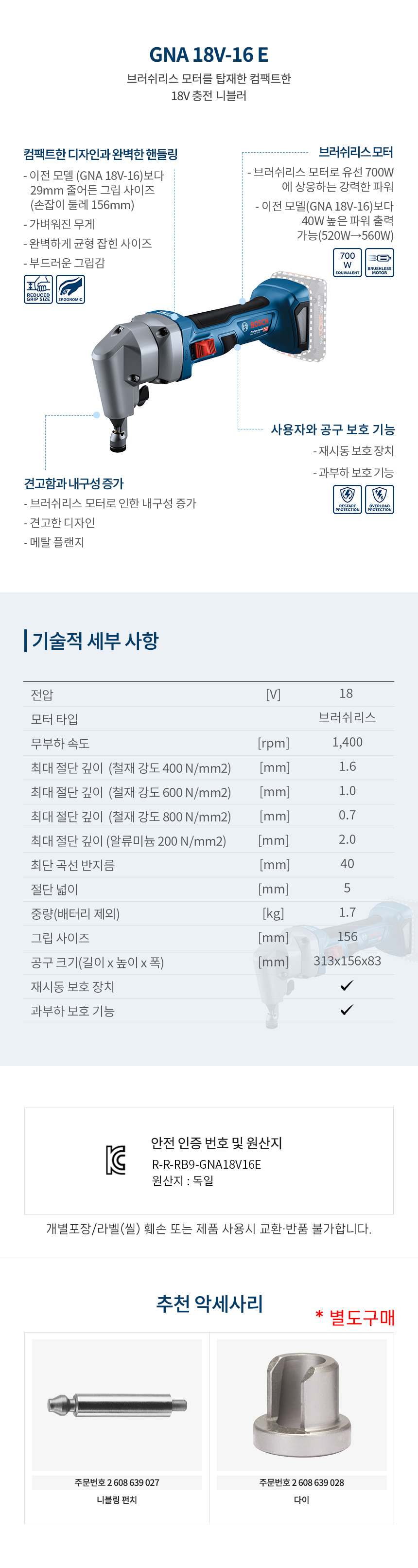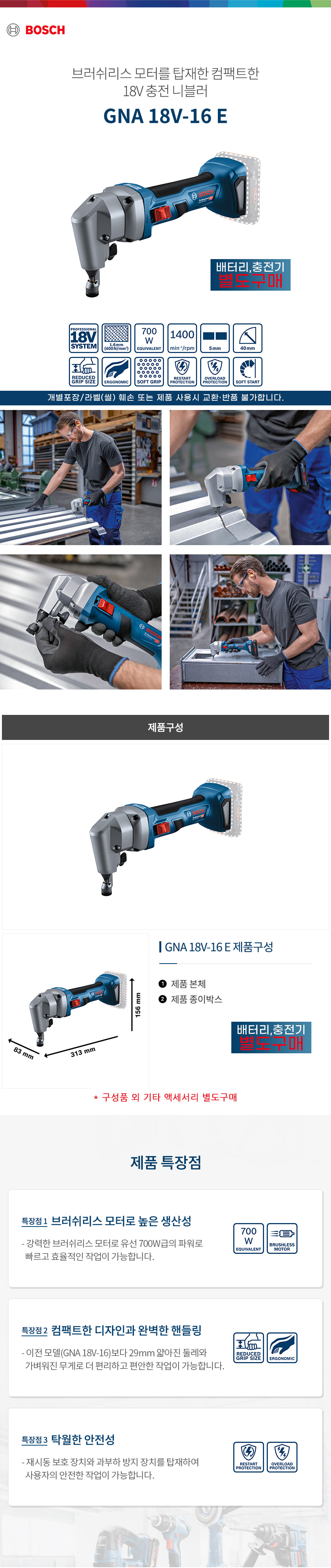 보쉬 GNA 18V-16 E 충전 니블러 베어툴 06015296B0 금속 절단 컷팅