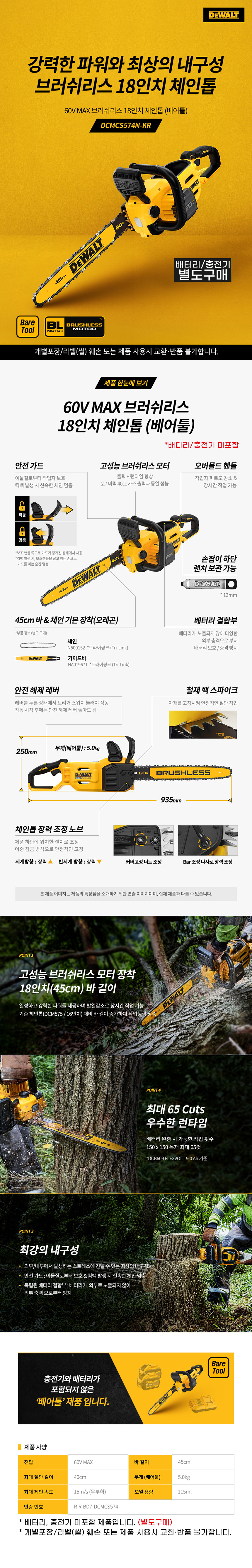 디월트 60V MAX 브러쉬리스 18인치 충전 체인톱 베어툴 DCMCS574N 기계톱 벌목 목재