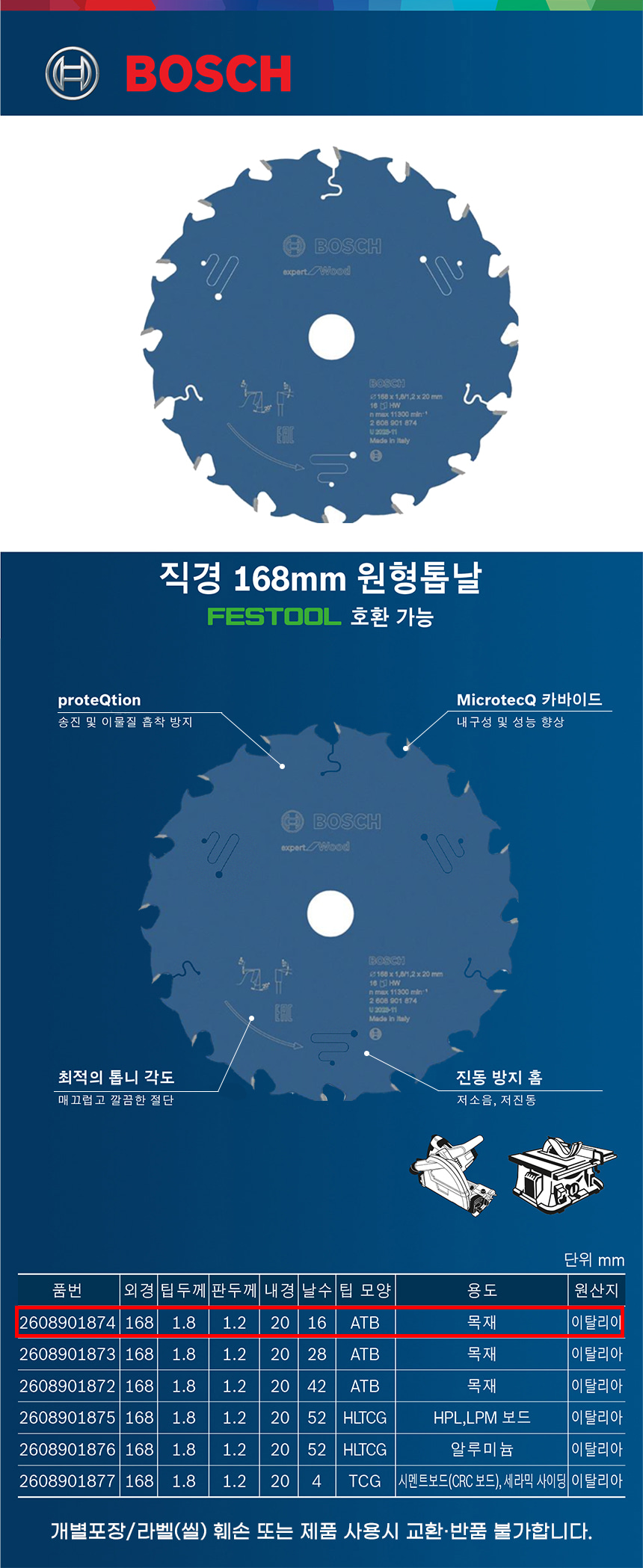 보쉬 Expert for Wood 원형 톱날 168x20x1.8 2608901874 목재 목공 우드 절단 팁쏘