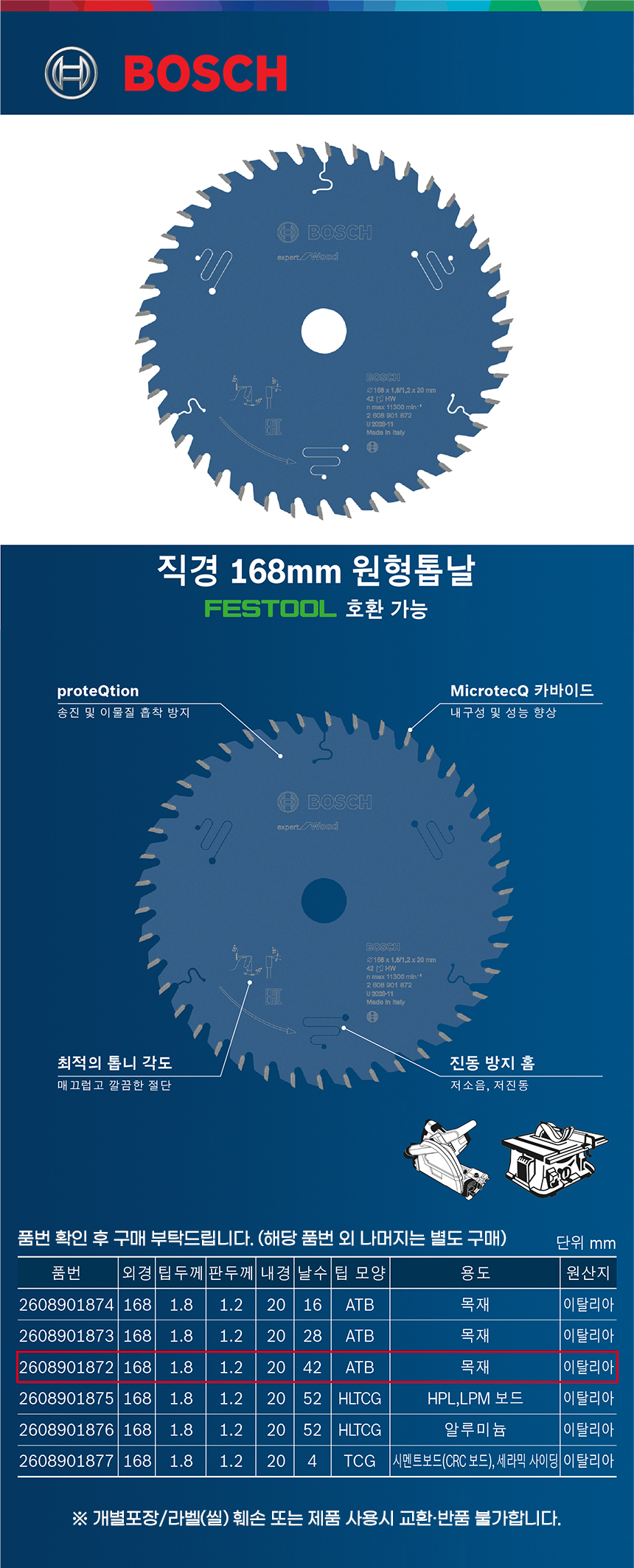 보쉬 Expert for Wood 원형 톱날 168x20x1.8 2608901872 목재 목공 우드 절단 팁쏘