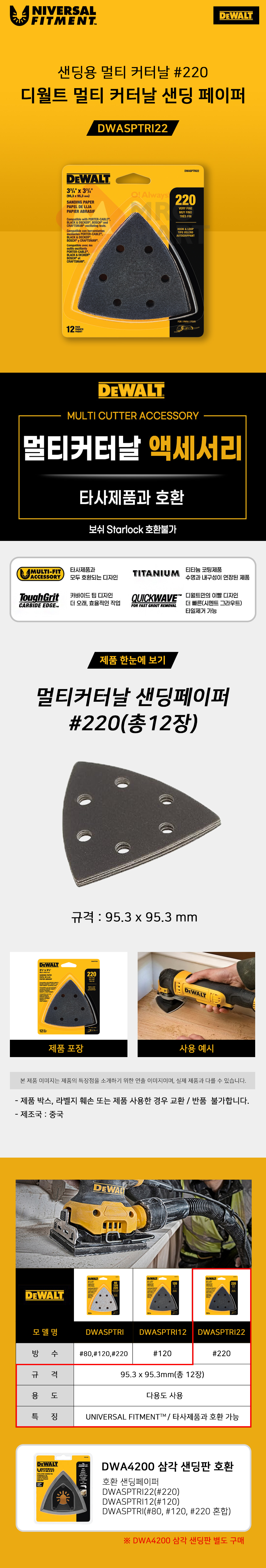 디월트 DWASPTRI22 멀티 커터날 샌딩 페이퍼 220방 12개입 삼각 다용도 사포 목재 석고보드