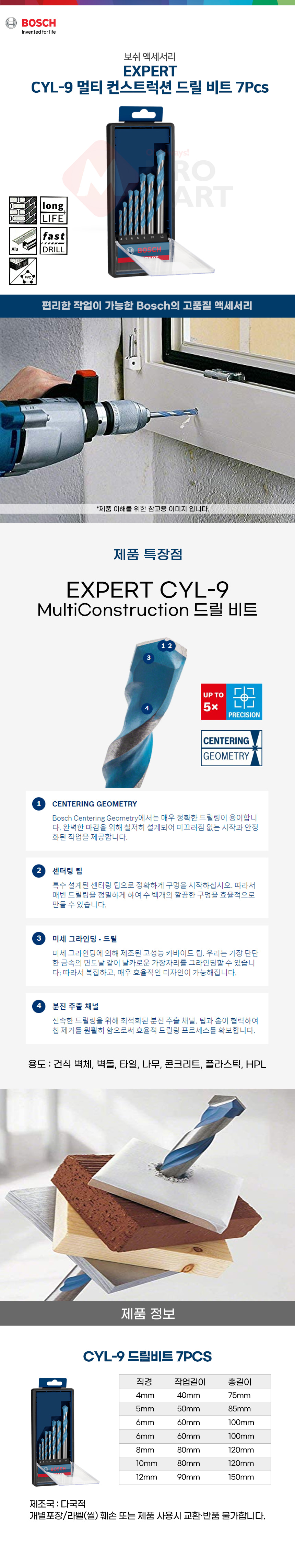 보쉬 EXPERT CYL-9 멀티 컨스트럭션 드릴 비트 세트 7PCS 2608900647 타일 콘크리트 플라스틱 벽돌 목재