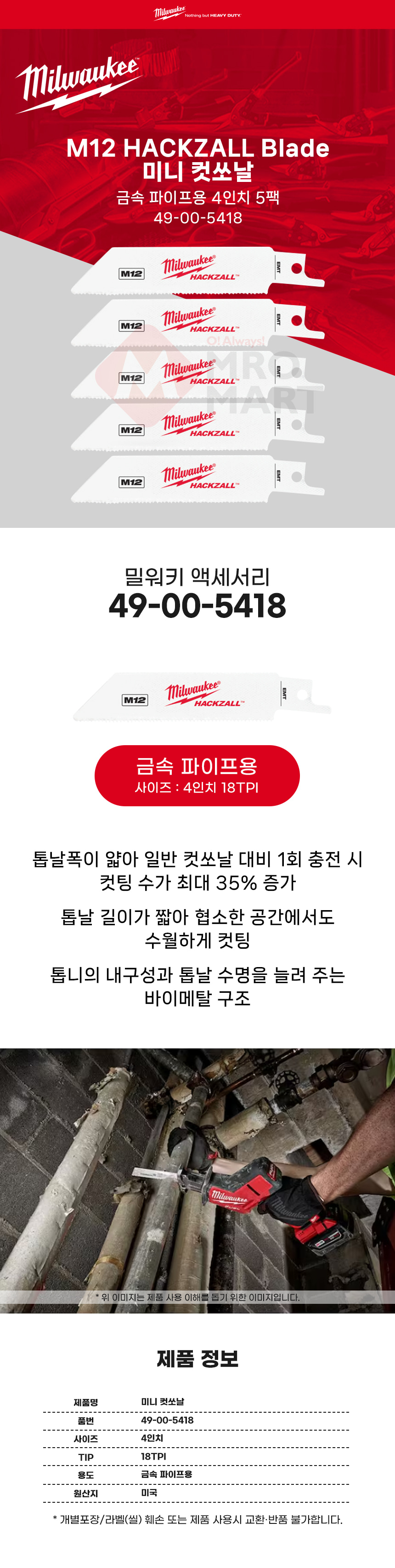 밀워키 4인치 미니 컷쏘날 5개입 49-00-5418 금속 파이프용
