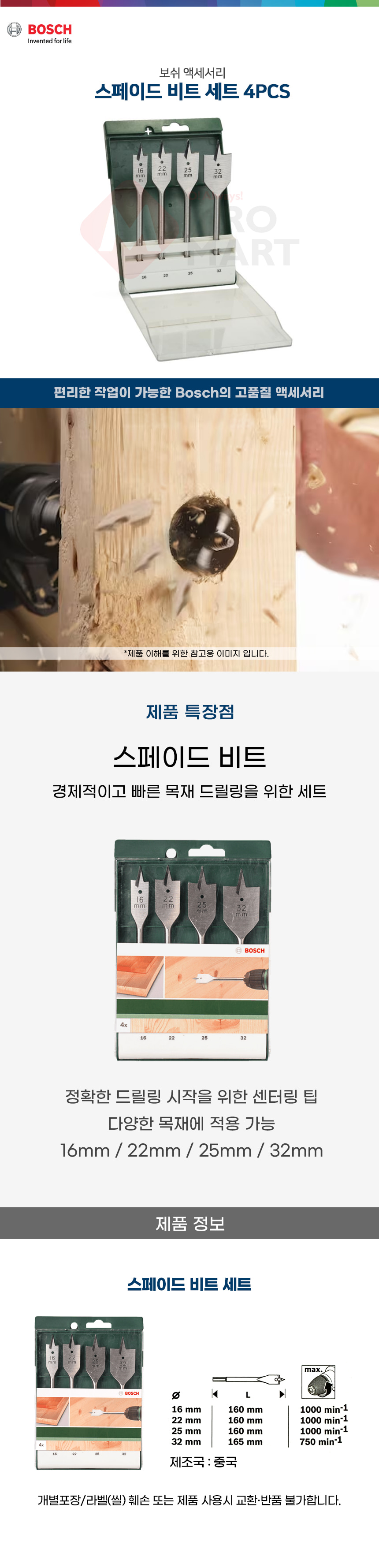보쉬 스페이드 비트 세트 4PCS 2609255275 목공 목재 나비 드릴 기리