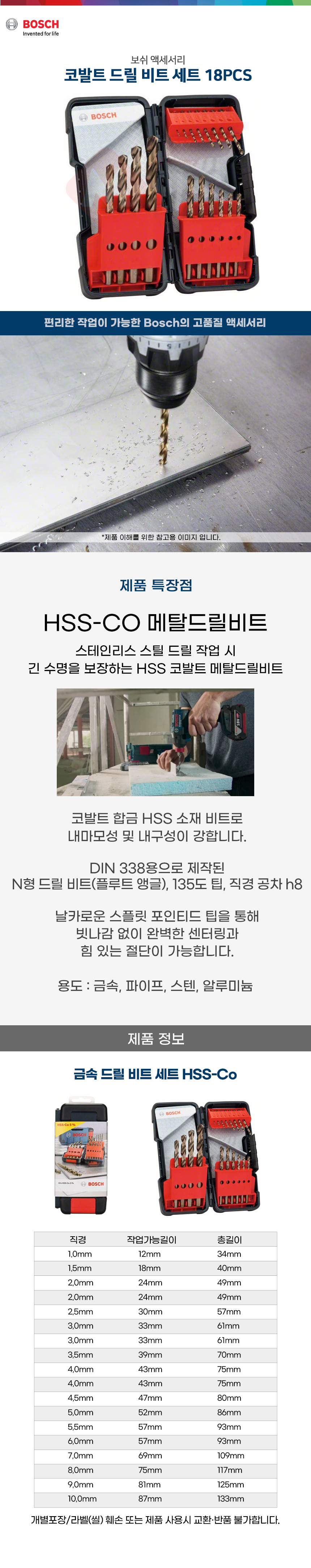 보쉬 HSS-co 코발트 드릴 비트 세트 18PCS 2607017047 금속 메탈 파이프 스텐 알루미늄
