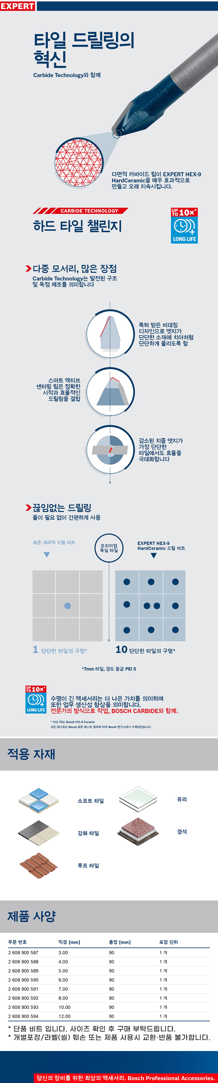 보쉬 EXPERT HEX-9 육각 하드 세라믹 드릴 비트 8x90mm 2608900592 타일 유리