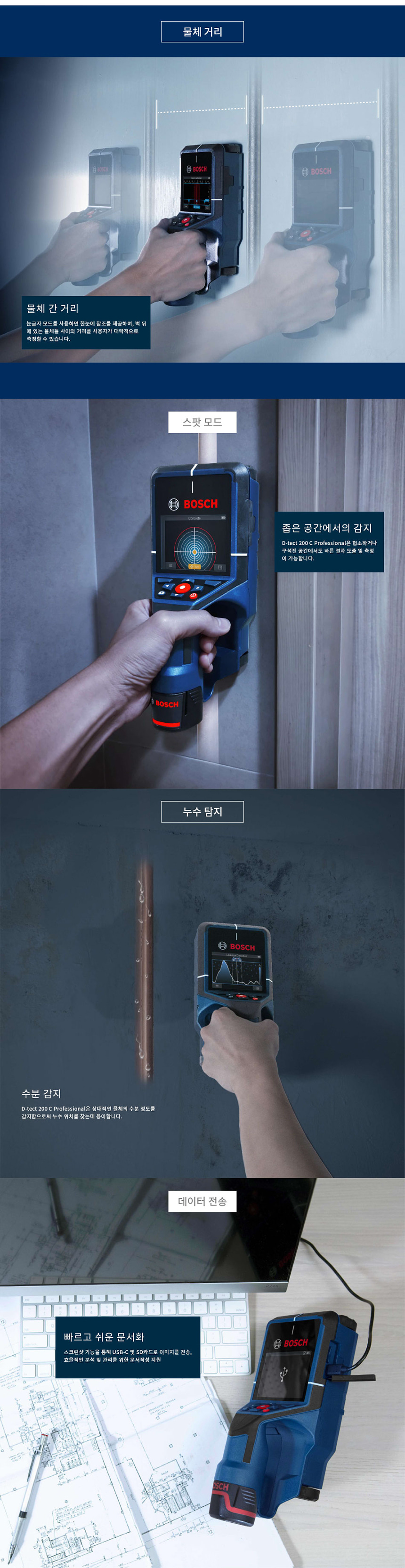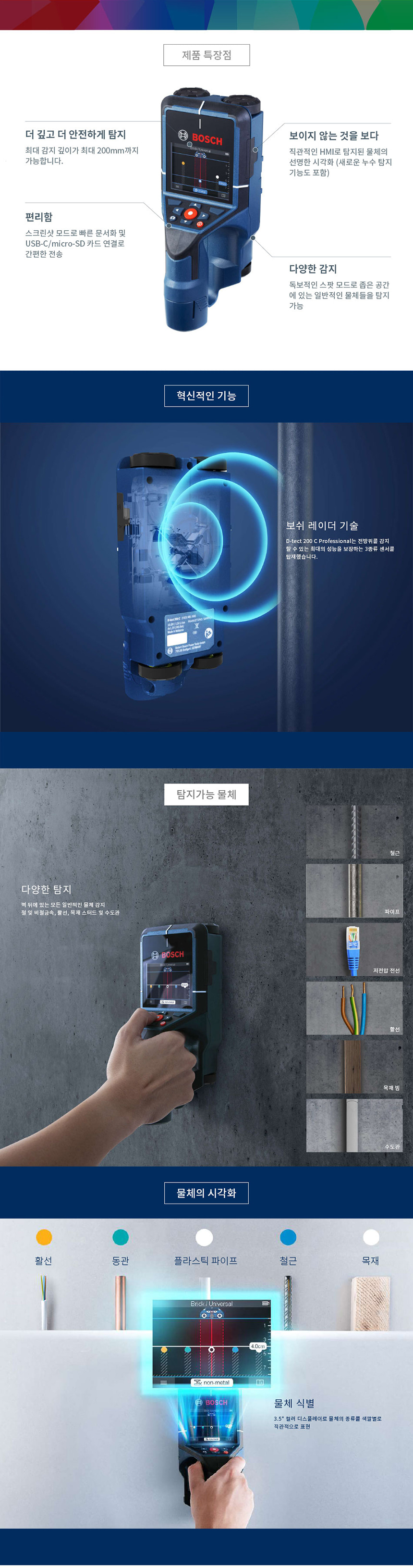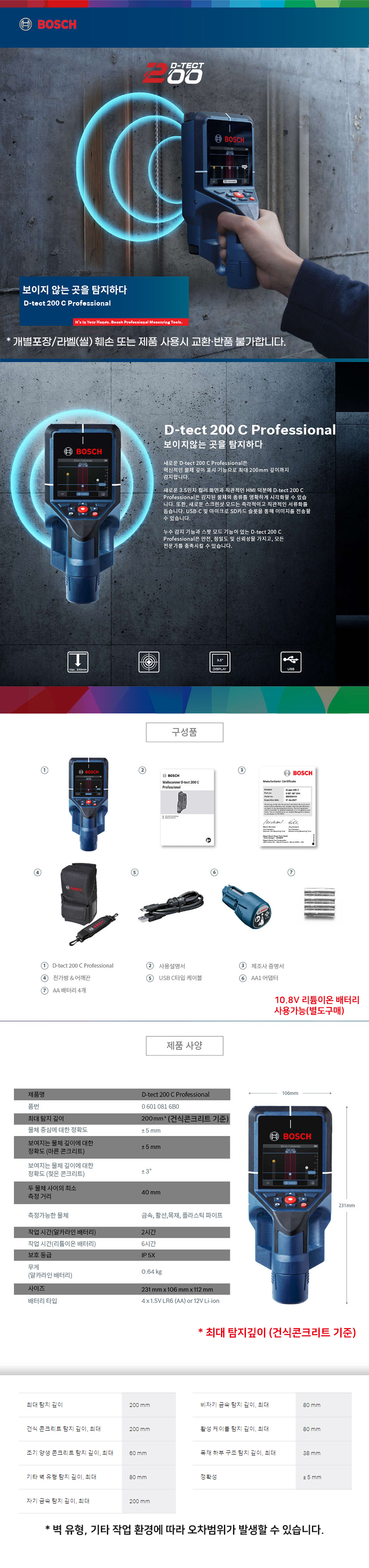 보쉬 벽 스캐너 산업용 다목적 탐지기 D-tect 200C 06010816B0 비철 철 활선 목재 수도관 누수 탐지