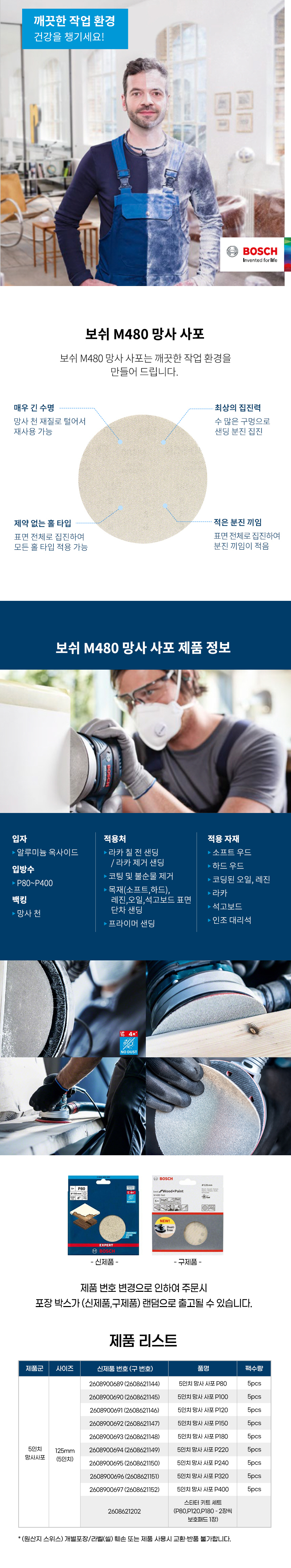 보쉬 EXPERT M480 원형 샌딩 망사 페이퍼 5인치 5매입 페파 사포 샌더기