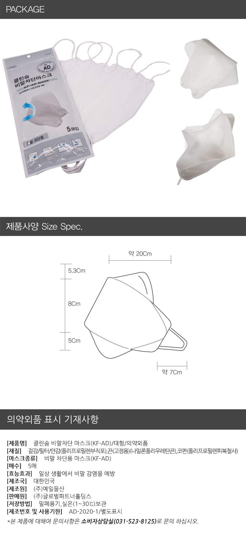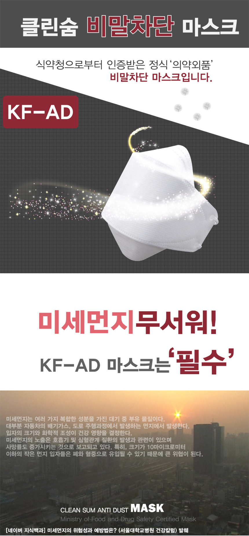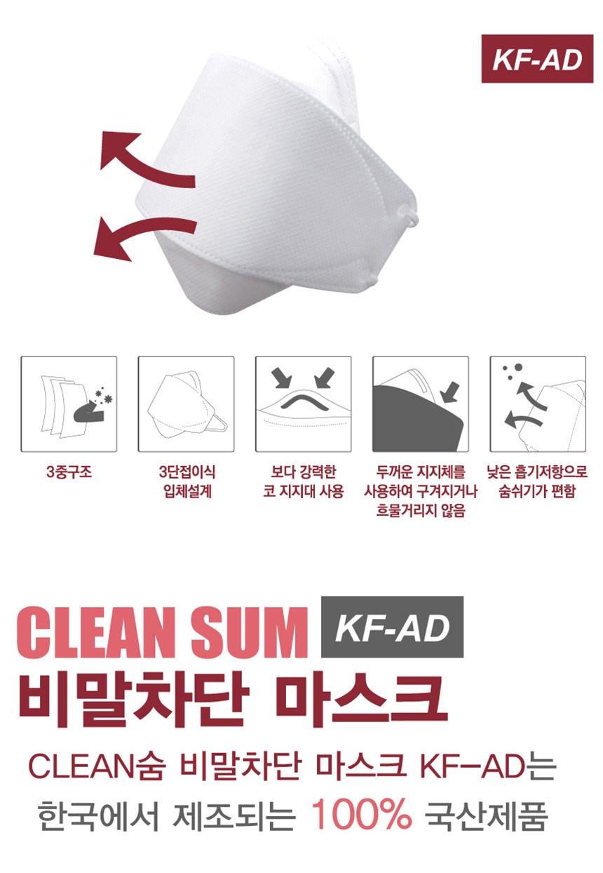클린숨 KF-AD 입체 비말 마스크 5매입 비말차단 일회용 3중 식약처허가