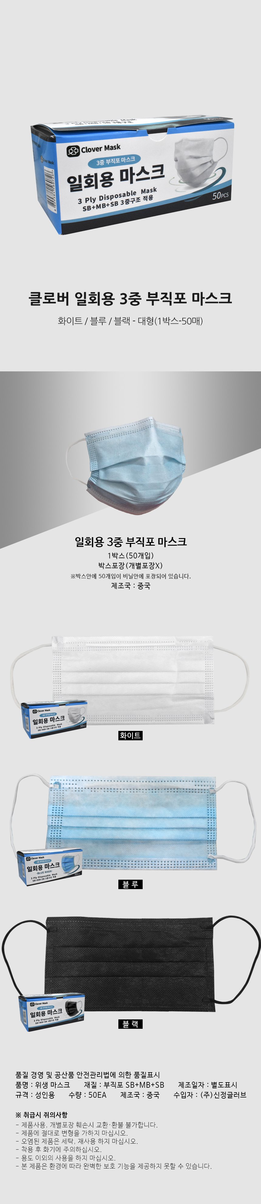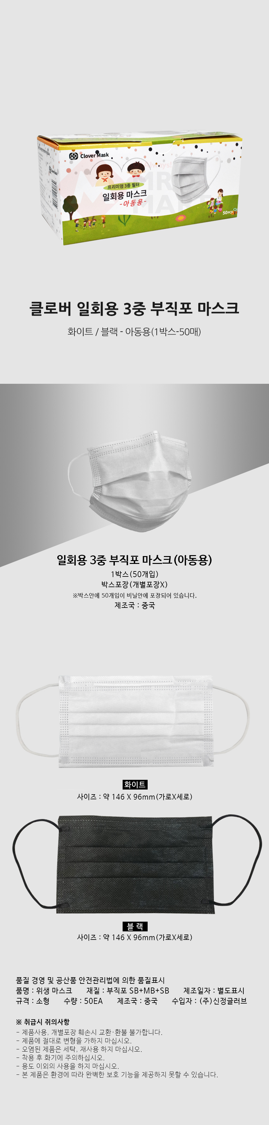 클로버 일회용 3중 부직포 마스크(50매) 성인용 아동용