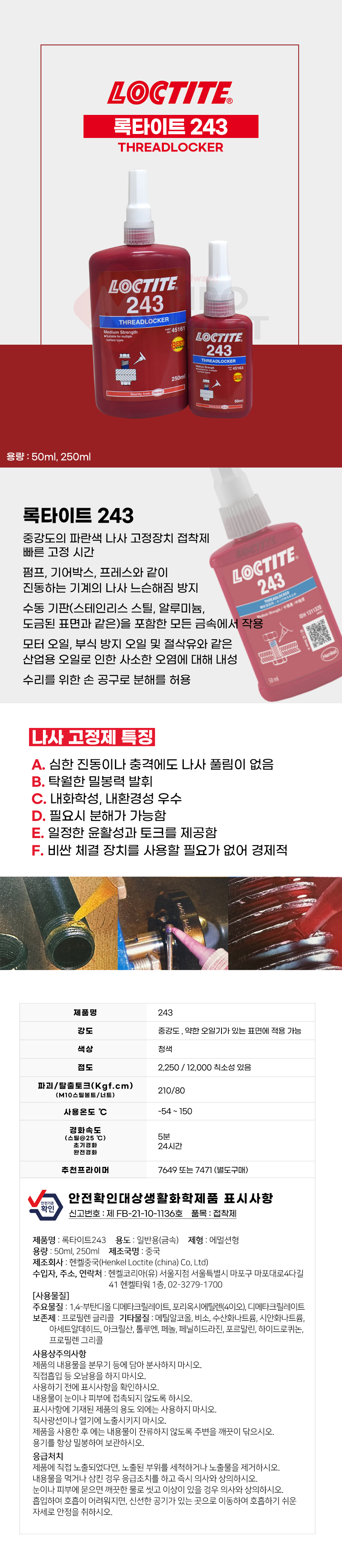 록타이트 243 나사 고정제 50ml 중강도 청색 볼트 풀림 방지