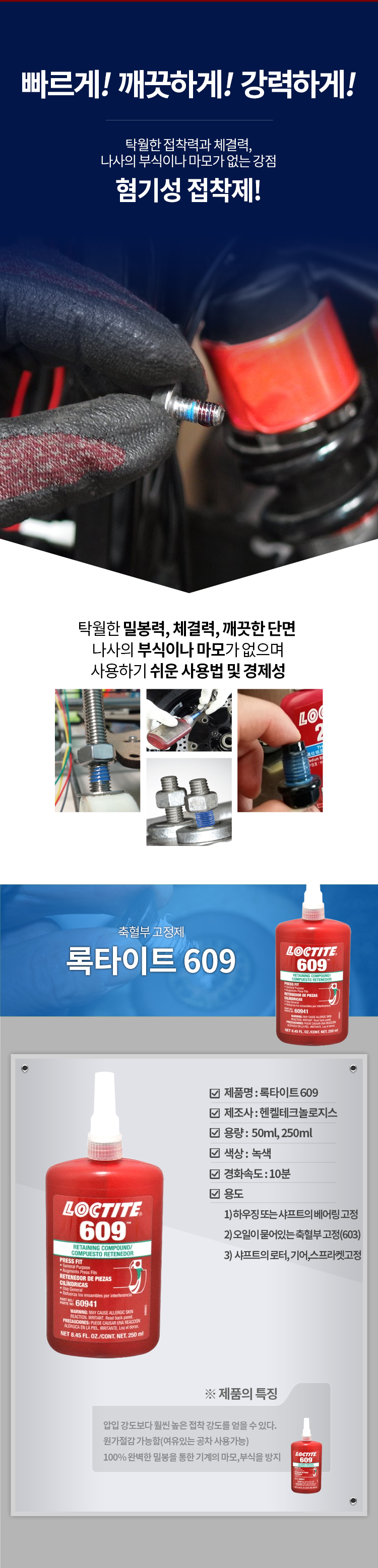록타이트 축혈부 고정제 609 250ml 저점도 녹색 압입 부위용 베어링