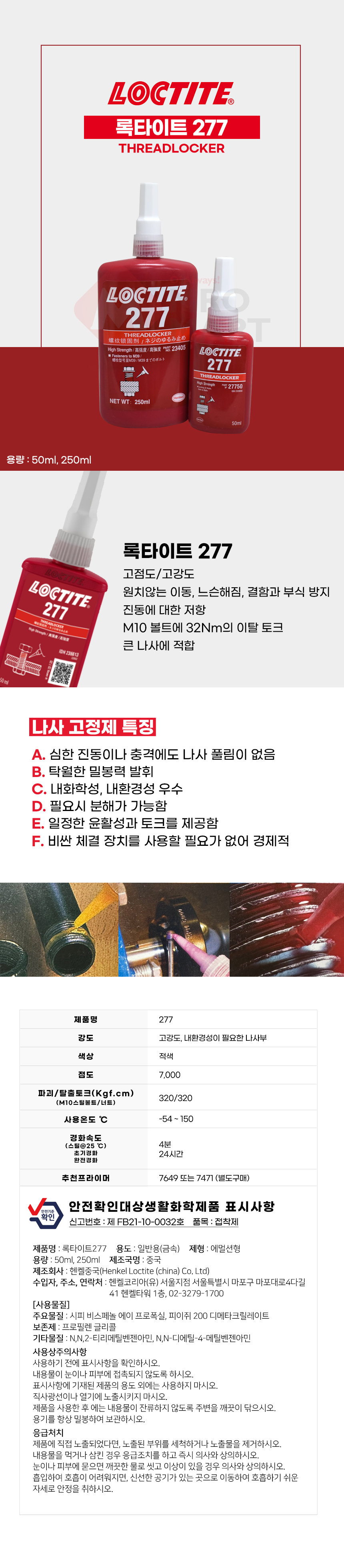록타이트 나사 고정제 277 50ml 풀림 방지 볼트 접착제 큰나사 적색 고강도