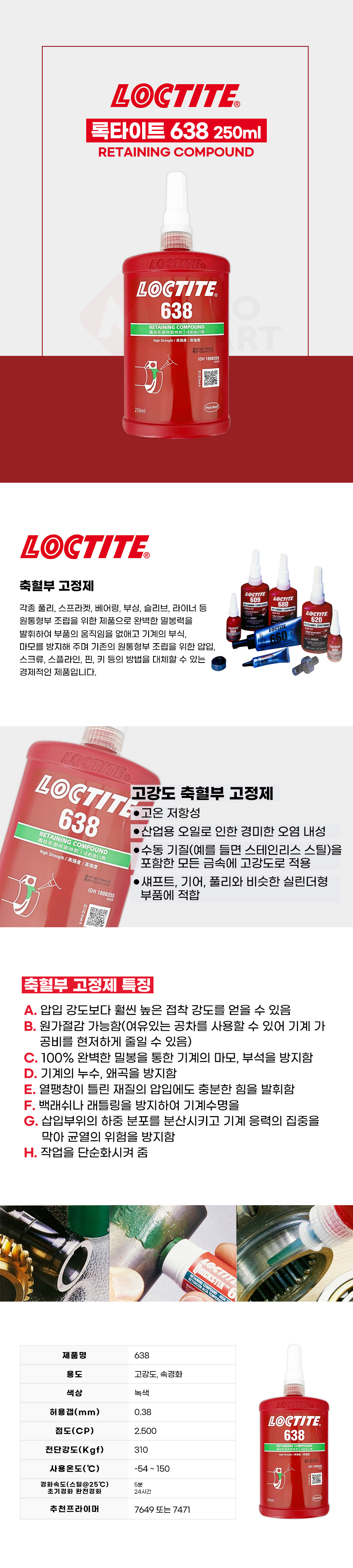 록타이트 638 축혈부 고정제 250ml 고강도 속경화 녹색 베어링 부싱 슬리브 조립