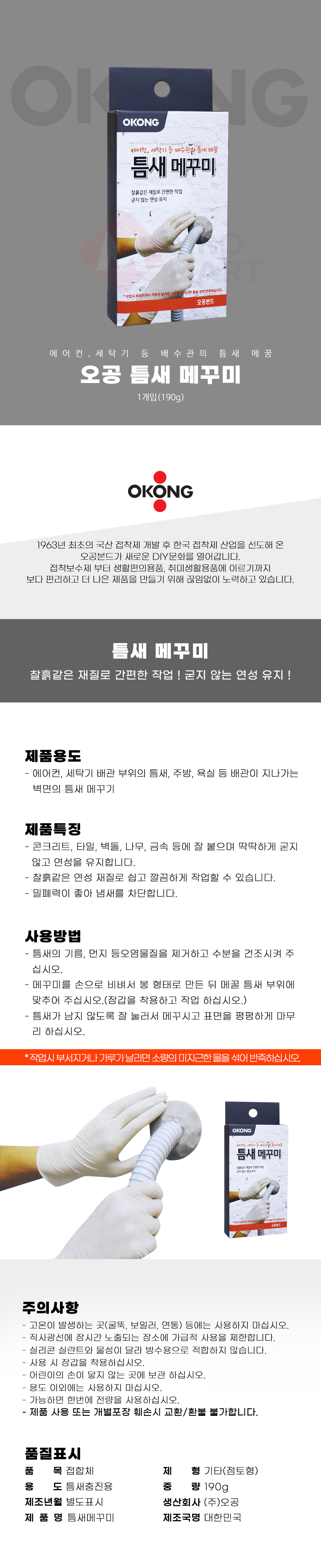 오공 틈새메꾸미 190g 배수관 틈새 변기 바닥면 사이 메꾸미