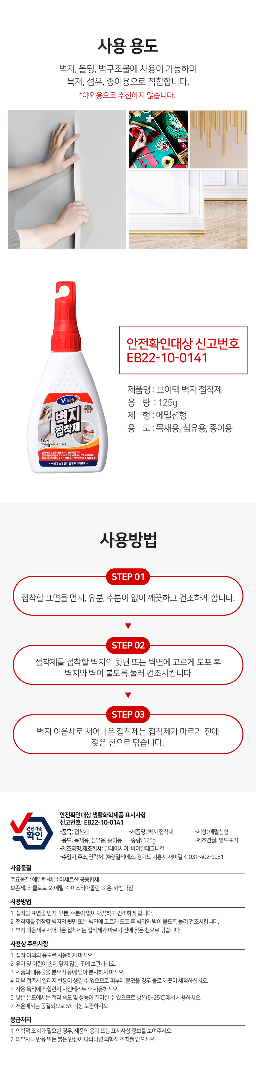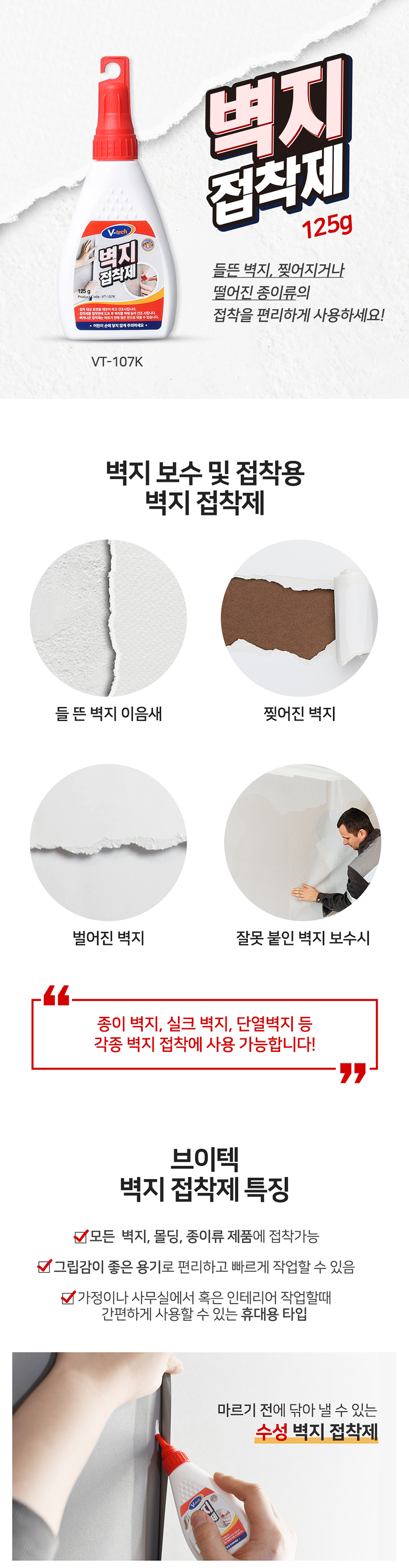 브이텍 수성 벽지 접착제 125g VT-107K 실크 단열 종이 벽지 목재 섬유 접착 부착 셀프 보수